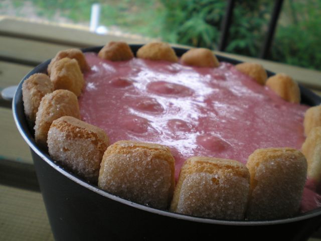 Incorporez le fromage blanc et les 100g de framboises entières en mélangeant bien, et garnissez le moule de biscuits cuilleres. Répartir la préparation et mettre au frigo au min 6h
