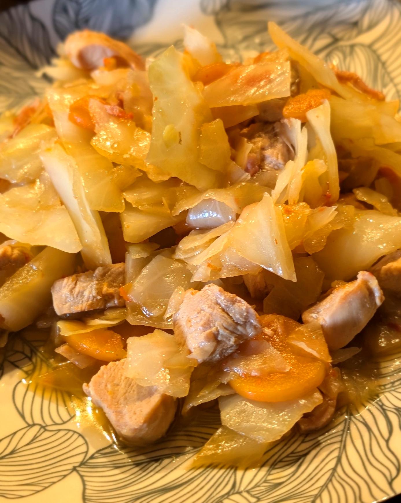 Ajoutez le chou blanc émincé, les carottes et les petits pois.