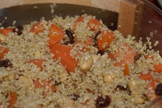 Plats & Cie > Salades Salade de quinoa Ingrédients 400 g de quinoa 5 à 6 carottes 2 à 3 poignées de raisins secs 1 càc de cannelle en poudre Coriandre 4 càs Huile d'olive 3 cà s de vinaigre balsamique 1càc de cumin en poudre 1 petite boites de pois chiches sel et poivre Recette Faire cuire le quinoa dans 3 fois son volume d'eau. les grains sont cuits lorsque leur germe est bien blanc. pas besoin d'égoutter normakement le quinoa absorbe toute l'eau. Laissez refroidir et décoller les graines avec une fourchettes comme pour la semoule Faites gonfler les raisins secs dans de l'eau chaude et faites cuire les carottes détaillées en petits tronçon dans de l'eau bouillante salée parfumée avec la cannelle. Egouttez et laissez refroidir Préparez la vinaigrette et versez tous les ingrédients dans un saladier, bien mélangez Parsemez de coriandre hachée