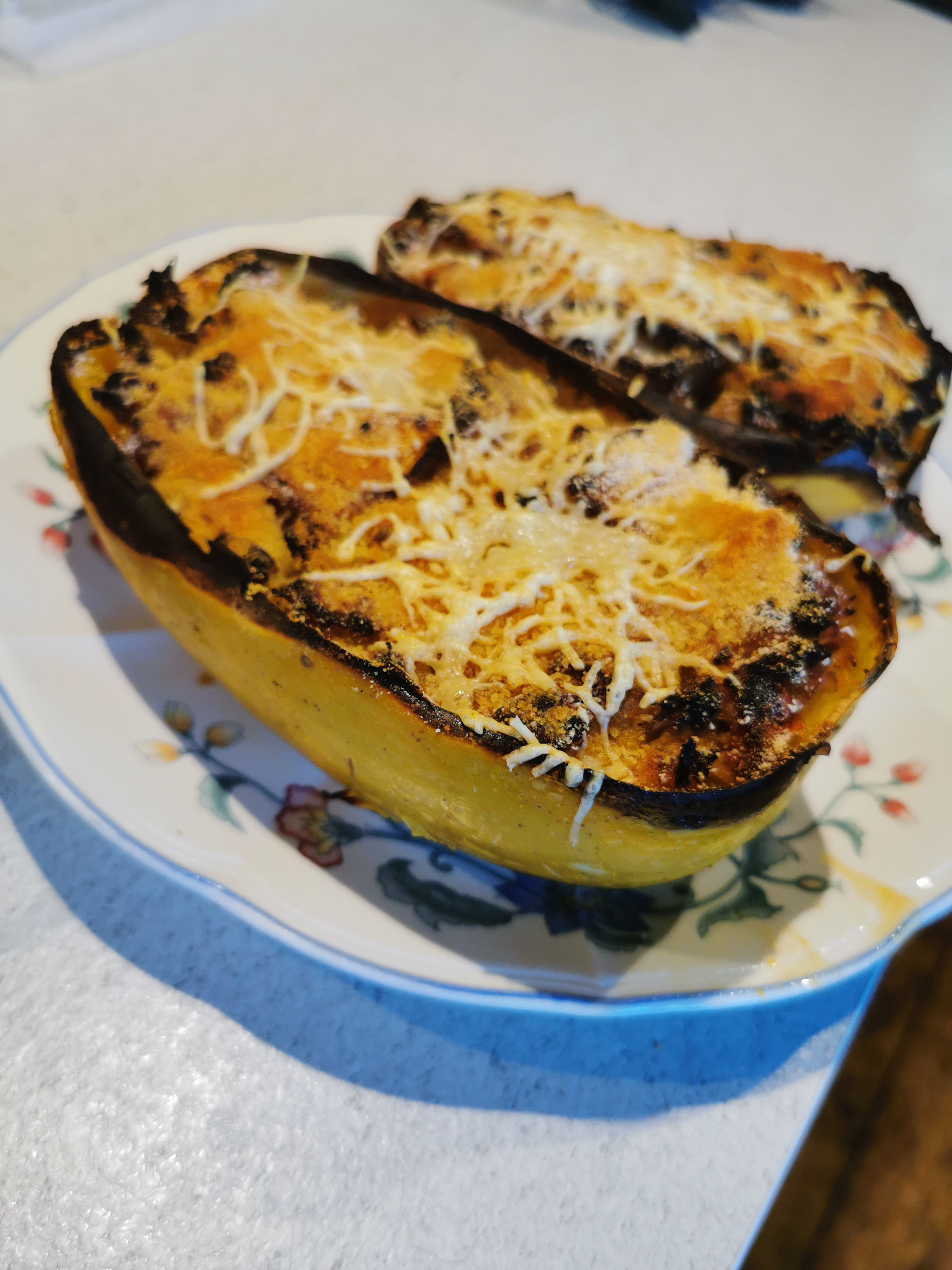 Garnissez les coques de la courge spaghetti, saupoudrez